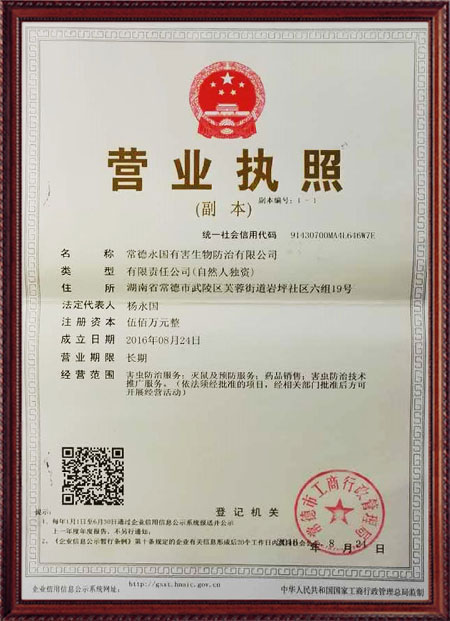 常德永國有害生物防治有限公司以常德市武陵區永科清潔服務中心來服務,2016年更名為常德永國生物防治有限公司。做這塊已有十多年豐富的理論支持和實經驗。技術專業、器械先進。旨在為賓館、酒店、超市、餐廳、工礦、機關團體、學校、醫院及家庭提供快捷、貼心的服務,根據客戶的實際情況、地理位置,解決鼠、蟲害問題。我們承諾:服務滿意后付款,只要一個電話解決您的煩惱問題。